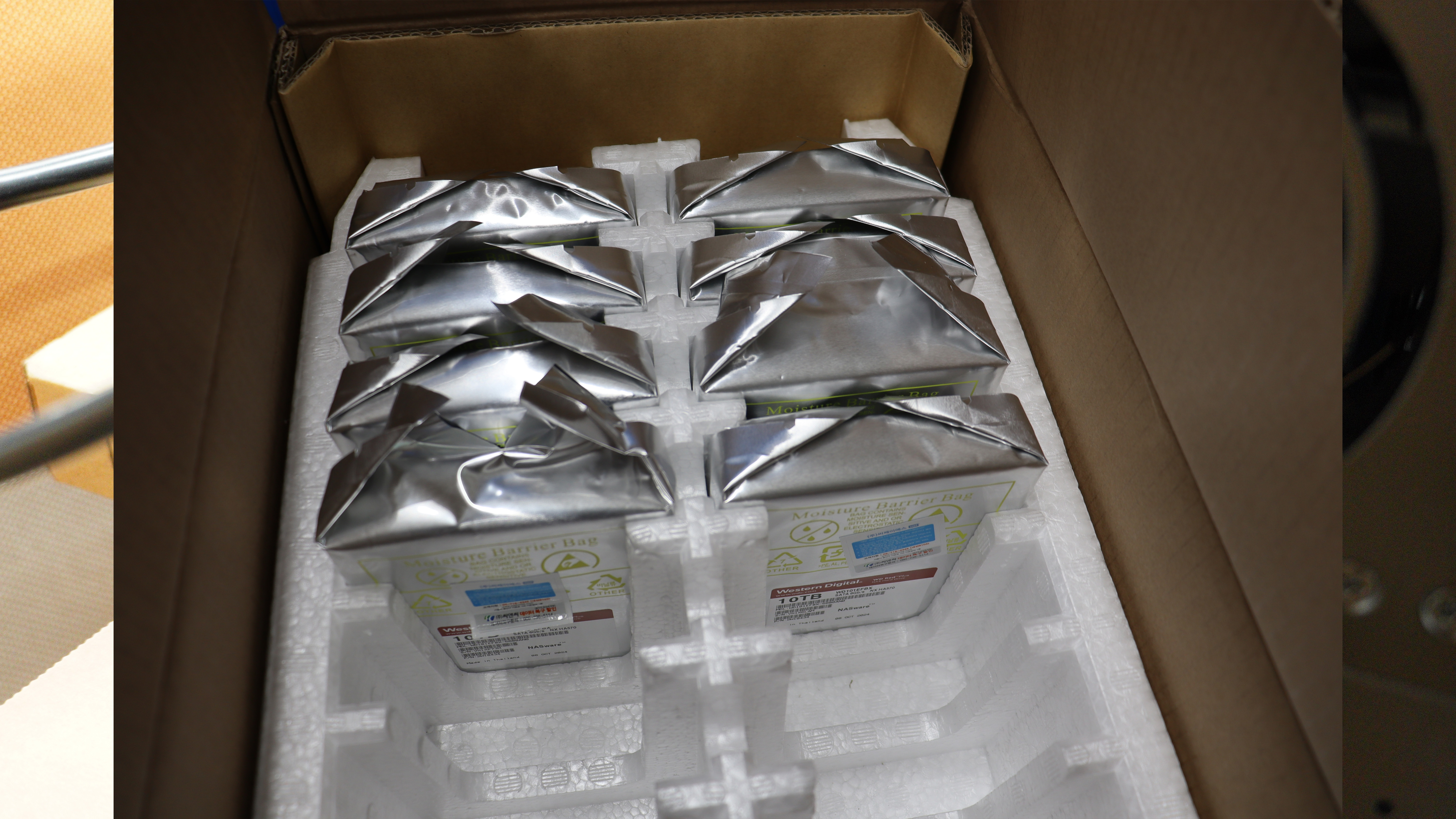 NAS를 사면 꼭 따라올 수밖에 없는 HDD입니다. NAS의 HDD 종류에 대해서는 나중에 다른 영상으로 자세히 살펴보겠지만 저장용으로 SSD를 사용하는 건 추천하지 않습니다. 수명이 생각보다 빨리 줄어들거든요. 어떤 NAS 사용자는 DS720+를 운용 중에 SSD를 NVMe 캐시로 썼는데 한 달이 지나니까 TBW(총 쓰기 가능 용량)가 100을 넘어버렸다고 하더라고요. 저장용으로 쓰면 더하겠죠. SSD가 성능이 더 뛰어나지만 네트워크 환경(1Gbps, 10Gbps)의 속도 한계로 SSD보다 저렴한 HDD 성능으로도 충분히 만족스러운 환경을 만들 수 있습니다.