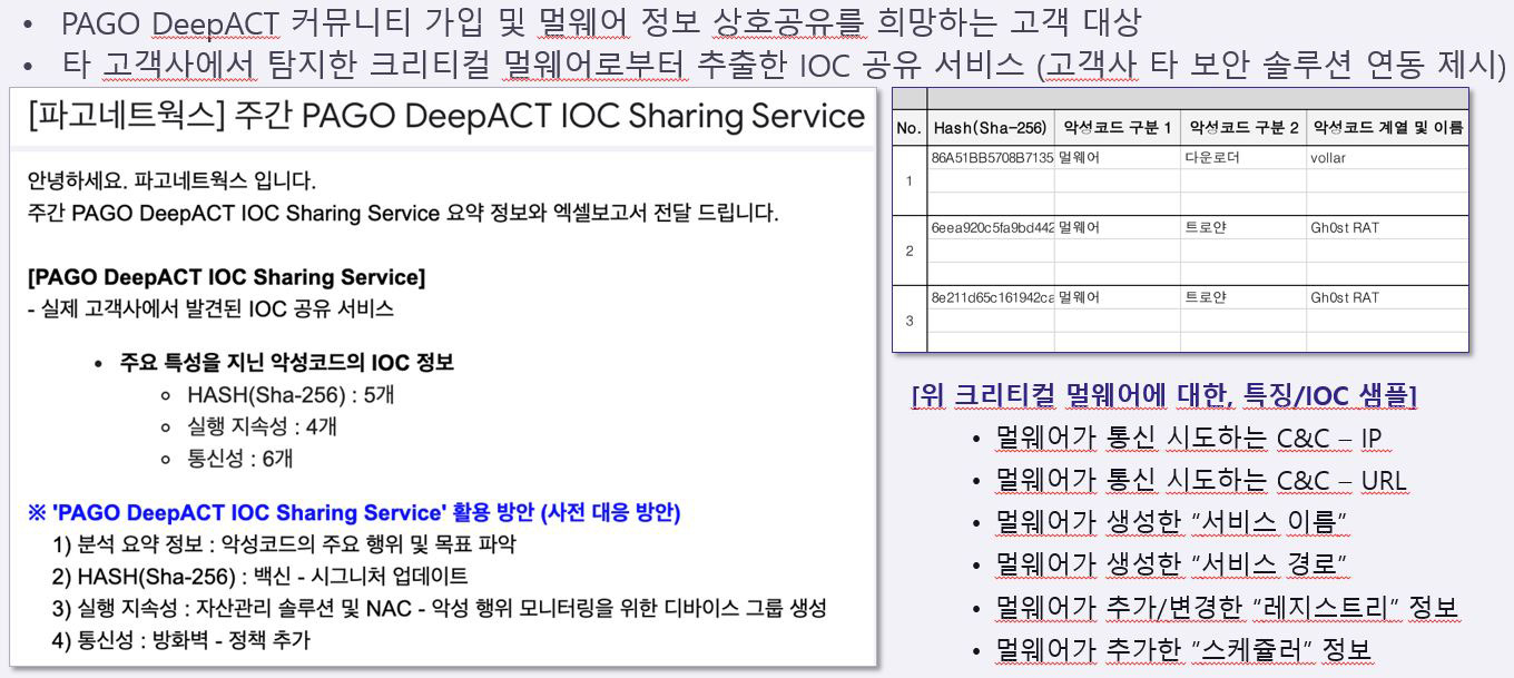 파고 DeepACT 위협 분석가는 CylancePROTECT, SentinelOne, Stellar Cyber 솔루션이 탐지/방어 성공한 모든 위협을 다시 분석하는 과정에서 'IOC/IOA'가 나온 경우, PAGO TIDB로 저장 및 고객사에 공유합니다.