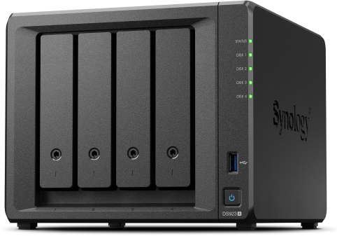 시놀로지사의 NAS, DS923+는 중소기업에 최적화된 4베이 NAS로, AMD Ryzen R1600 듀얼 코어 프로세서를 탑재해 빠른 데이터 처리 속도를 자랑합니다. 기본 4베이 구성으로 최대 72TB까지 저장 공간을 확보할 수 있으며 확장 유닛 DX517을 통해 최대 9베이까지 확장이 가능합니다. 또한 M.2 NVMe SSD 슬롯을 통해 캐시를 추가해 데이터 읽기/쓰기 속도를 높일 수 있고 10GbE 네트워크 업그레이드를 지원해 대규모 파일 전송에도 원활히 대응합니다. 이외에도 Synology Drive를 통해 사내외 직원들이 동일한 파일을 공유하고 실시간으로 협업할 수 있으며 RAID 5 구성으로 데이터를 보호해 안정성을 강화했습니다.