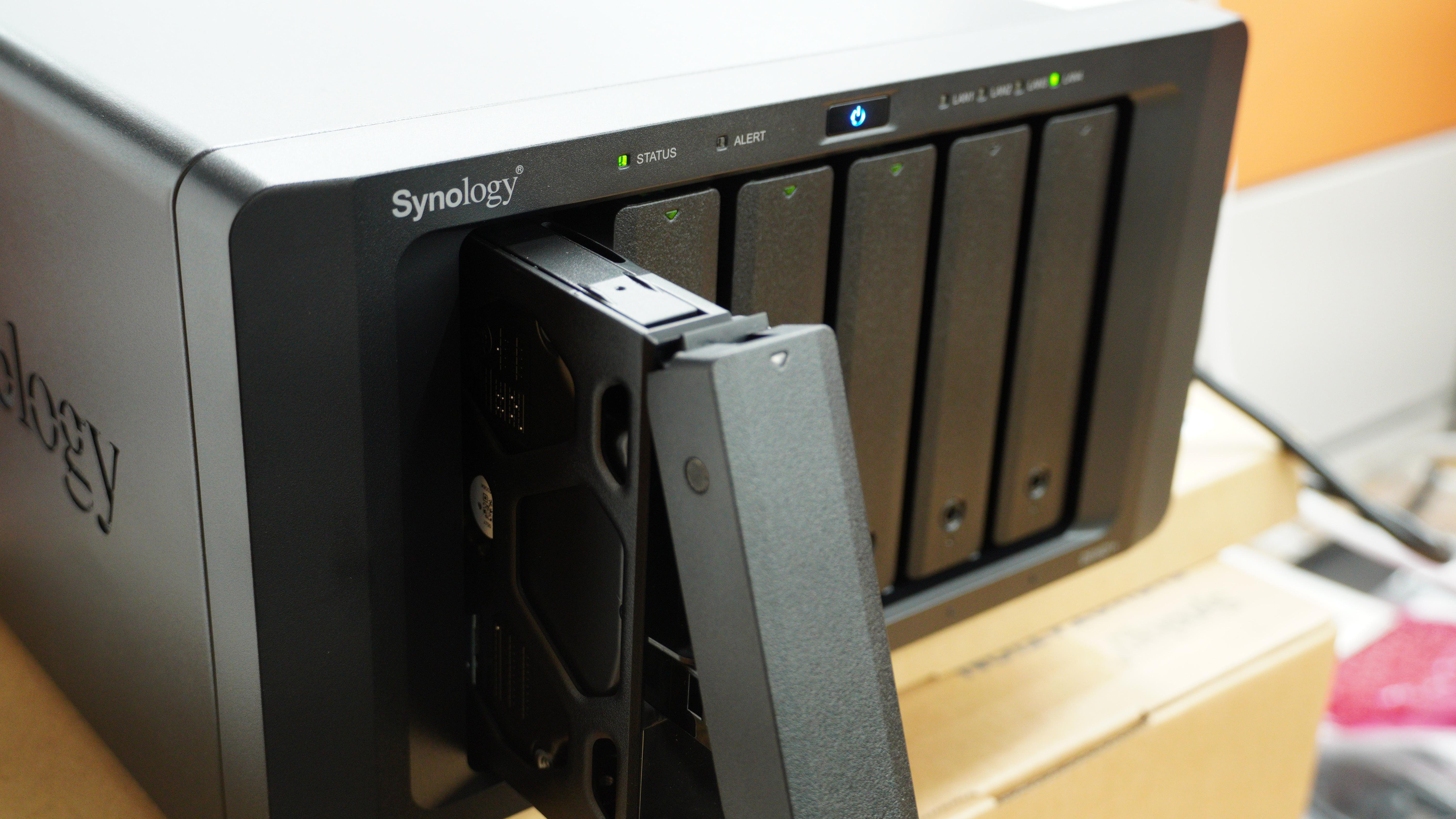다음은 DS1621+에 하드 드라이브를 설치하고 고객사의 요구에 맞춰 RAID 5를 선택하여 데이터 보호와 용량을 적절히 조정했으며 10GbE 네트워크 카드와 스위치를 연결해 빠른 데이터 전송 속도를 확보했습니다.