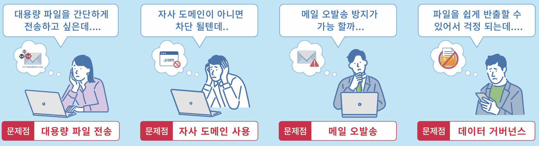 기업에서는 종종 대용량 파일을 이메일로 전송하기 어려운 문제를 겪어요. 메일 첨부 용량 제한으로 인해 업무가 지연되거나 파일을 보내야 할 때 회사 도메인이 아닌 경우 메일이 차단되는 등의 불편도 뒤따르죠. 그리고 오발송으로 인한 정보 유출 위험과 메일 시스템 자체가 파일을 쉽게 반출할 수 있다는 구조라는 점도 기업 보안의 취약점으로 작용합니다.