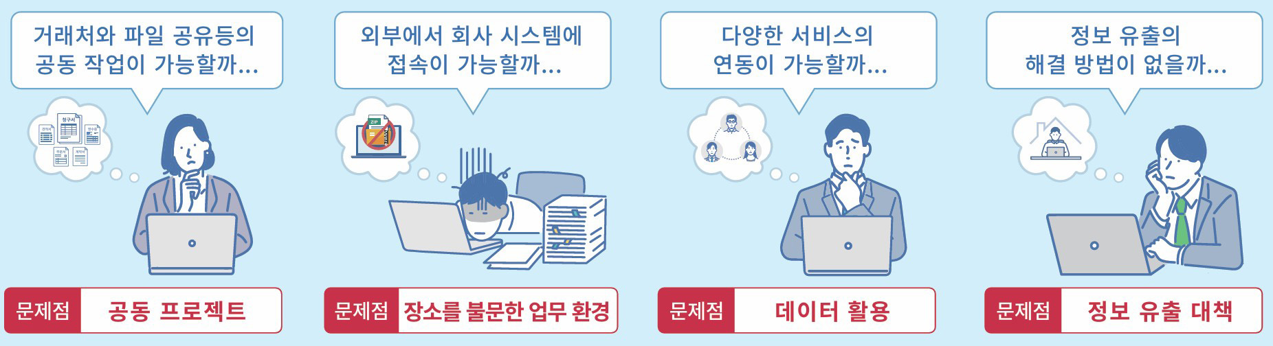 기업은 재택근무나 거래처와의 파일 공유와 같은 외부와의 협업이 필수적인데요. 거래처나 외부 파트너와의 파일을 공유하며 협업할 수 있는 기능이 부족하고 재택이나 외근 중에는 회사 시스템에 접속할 수 있는 환경이 필요해요. 또한 업무 효율을 높이기 위해 다양한 외부 서비스와 연동도 필요하고 외부와의 파일을 주고받거나 시스템 접속 과정에서 정보 유출의 위험이 존재하죠.