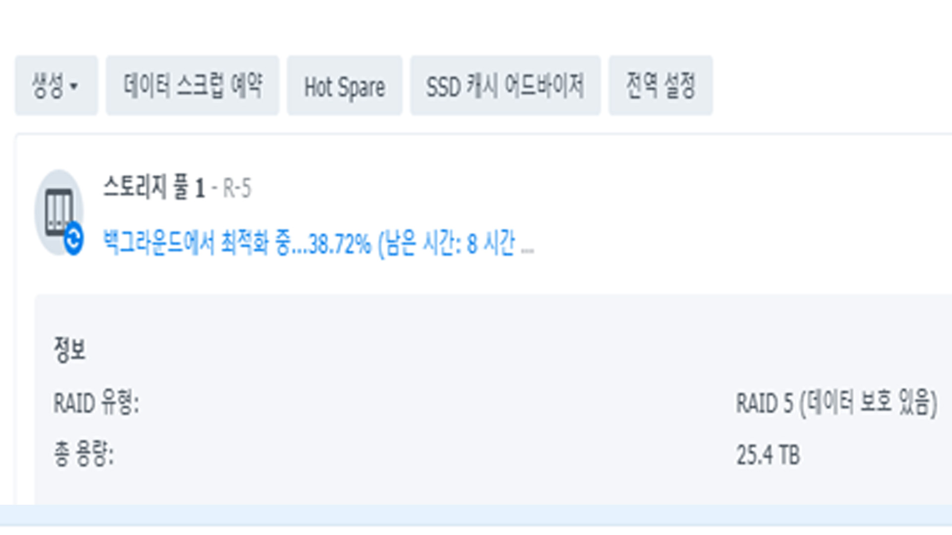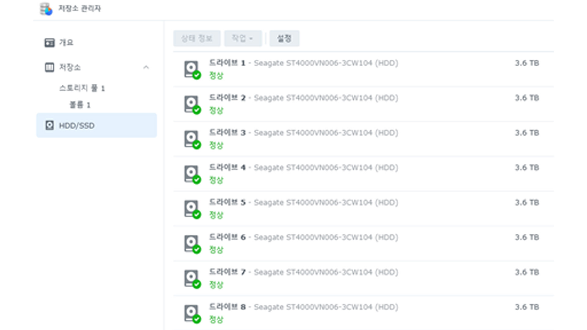 장비의 안정성을 위해 고객사는 HDD 전량 교체를 결정했습니다. 이번에 하드디스크는 시놀로지 호환 검증을 가진 4TB HDD 5개이며 교체 후에는 백그라운드 최적화를 통해 스토리지 상태를 점검하고, 장기적인 안정성을 확보했습니다.