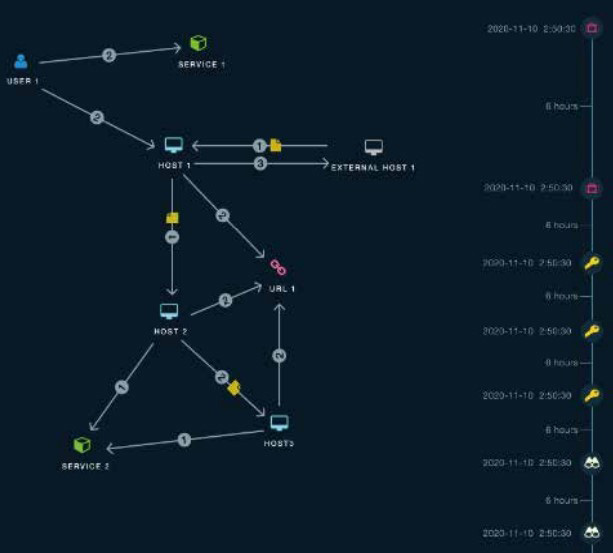 전체 공격 수행 관계에 대한 히스토리 분석 및 상관관계 분석을 통해 현재 공격에 노출된 내부 자산 및 공격 흐름을 명확하게 파악할 수 있도록 도식화