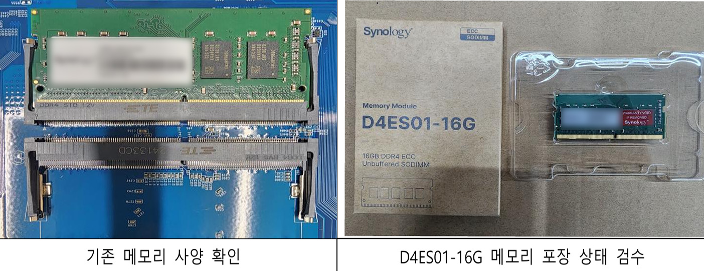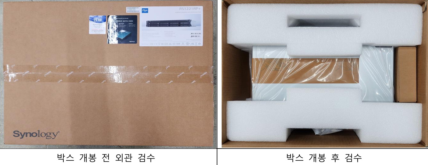 Synology NAS RS1221RP+ 본체와 구성품이 신규로 입고되었어요. 가장 먼저 제품의 외관 상태를 꼼꼼히 점검하고 구성품 수량을 확인해 초기 불량이나 누락 사항이 없는지 확인했습니다. 이후 제품에 전원을 연결하고 DSM 운영체제를 설치한 뒤 최신 버전으로 업데이트를 진행합니다. 이 과정에서 RAID Controller의 정상적인 인식을 확인하고 준비된 HDD 6개를 장착해 데이터 안정성을 위한 RAID 5 구성을 마쳤어요. RAID 5는 하나의 드라이브가 실패해도 자료가 안전하게 보호되므로, 약 27.5TB의 유효 저장 공간을 효율적으로 확보할 수 있었습니다. 또한 기존 4GB 메모리를 16G RAM으로 교체해 시스템 성능을 한층 더 끌어올렸어요.