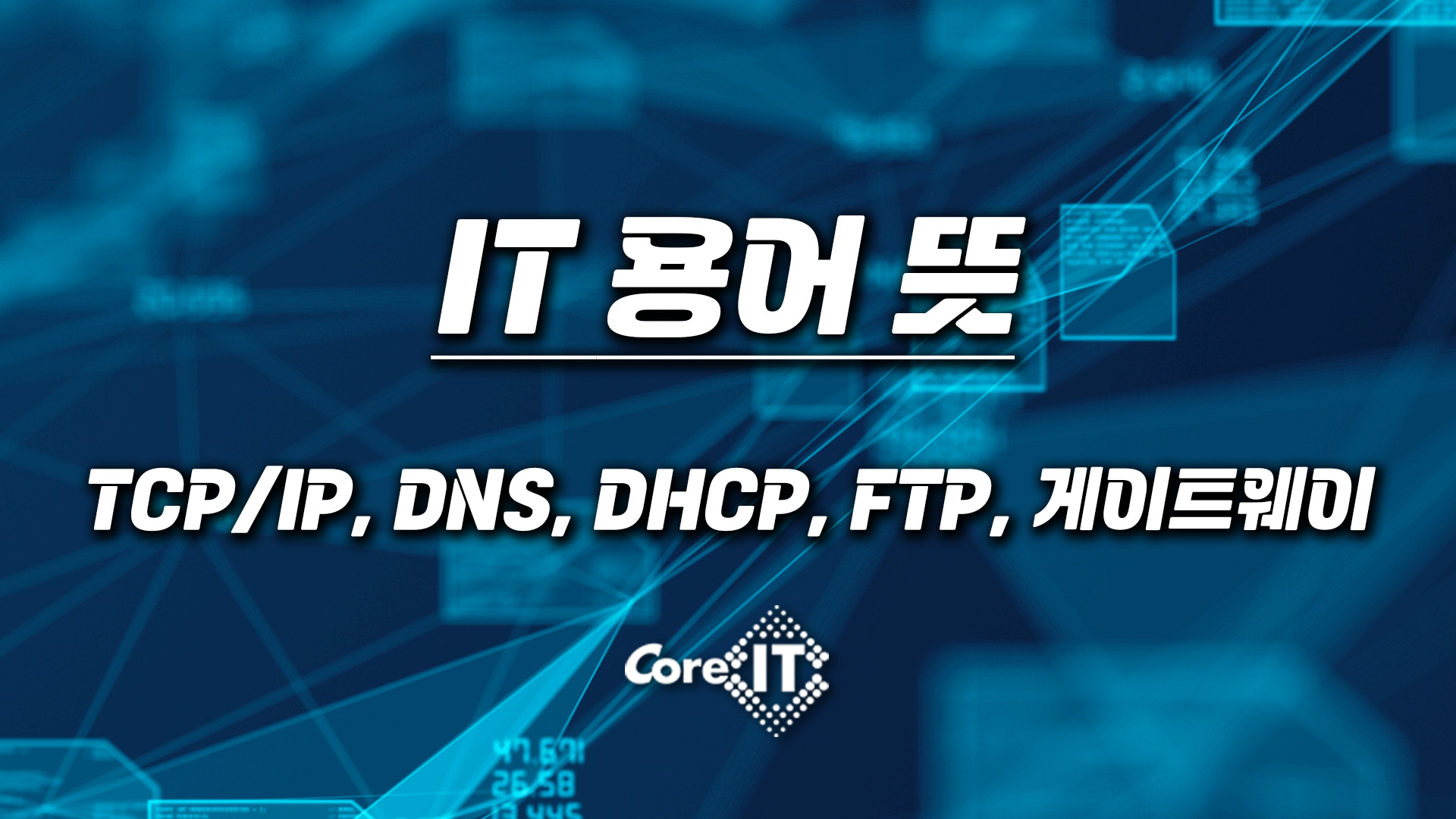 안녕하세요. 코아아이티입니다. 인터넷은 우리가 매일 사용하지만 정작 그 작동 원리를 이해하는 건 쉽지 않아요. 하지만 몇 가지 핵심 용어만 알아도 어떻게 데이터를 주고받는지 쉽게 파악할 수 있는데요. 이번에는 인터넷 기본 용어인 TCP/IP, DNS, DHCP, 게이트웨이, FTP가 무엇인지 간단하게 알아보도록 하겠습니다.