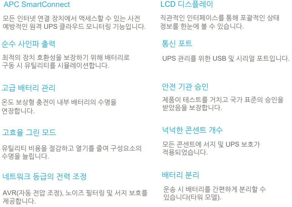 APC Smart-UPS는 세계적인 인기를 자랑하는 서버로 스토리지 및 네트워크 전력 보호용 UPS입니다. 네트워크의 활용도 및 관리 편의성을 높여주기 때문에 비즈니스 가동 중단이 아닌 비즈니스 성장에 집중할 수 있습니다. 또한 완전하고 안정적인 네트워크 등급의 전력을 공급하여 전력 문제로부터 중요한 데이터 및 장비를 보호합니다.