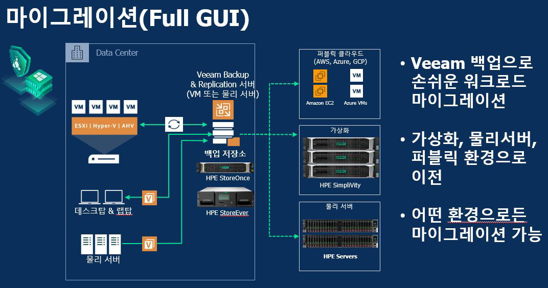 마이그레이션이란 데이터, 소프트웨어, 하드웨어, 애플리케이션 또는 운영체제 등을 한 시스템에서 다른 시스템으로 이전하는 과정입니다. 워크로드 마이그레이션은 자주 발생하는 상황이 되었습니다. 온프라미스 -> 가상화 및 클라우드로의 이동 등 이기종 플랫폼으로 워크로드를 이관하는 일은 자주 발생하고 있으며 앞으로는 이러한 일들이 더 자주 발생하리라 판단이 됩니다. 워크로드 이관은 서비스 다운 타임 및 공수를 얼만큼 많이 들여야 하는지, 비용은 얼마나 발생하는지에 대한 고민들을 항상 가지고 계시지만 Veeam을 사용하게 되면 별도의 비용 없이 Veeam을 이용하여 손쉽게 마이그레이션할 수 있습니다.