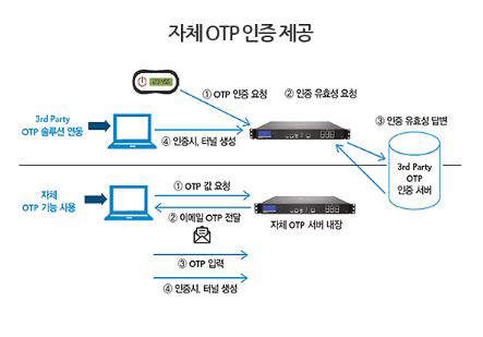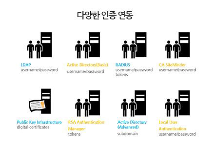 ![]() - LDAP, AD, RADIUS, RSA, CA, PKI, Local DB 등 고객에 맞는 다양한 인증 서버와 연동합니다. - 자체 OTP(One Time Password) 및 3rd Party OTP를 통한 Two factor 기능을 구현합니다. - 모바일 SDK 제공을 통한 다양한 연동 방안을 제공합니다. ![]() |