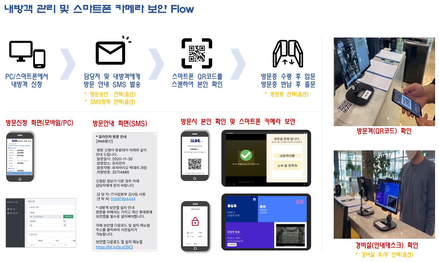 내방객 관리 시스템은 PC와 모바일을 통해 방문 신청을 하고 MDL 내방객 보안 앱만 설치하면 입문할 때는 스마트폰에 있는 카메라가 잠금 상태가 되고 출문할 때는 스마트폰 카메라가 해제되어 방문자 출입 과정이 쉽고 간단해지며 보안은 더욱더 강화됩니다.