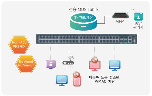 - ACL 정책 제어 방식이 아닌, MDS 엔진에서 IP/MAC을 관리, 제어하여 장비당 8K 이상 사용자 IP 관리 및 상세로그 제공