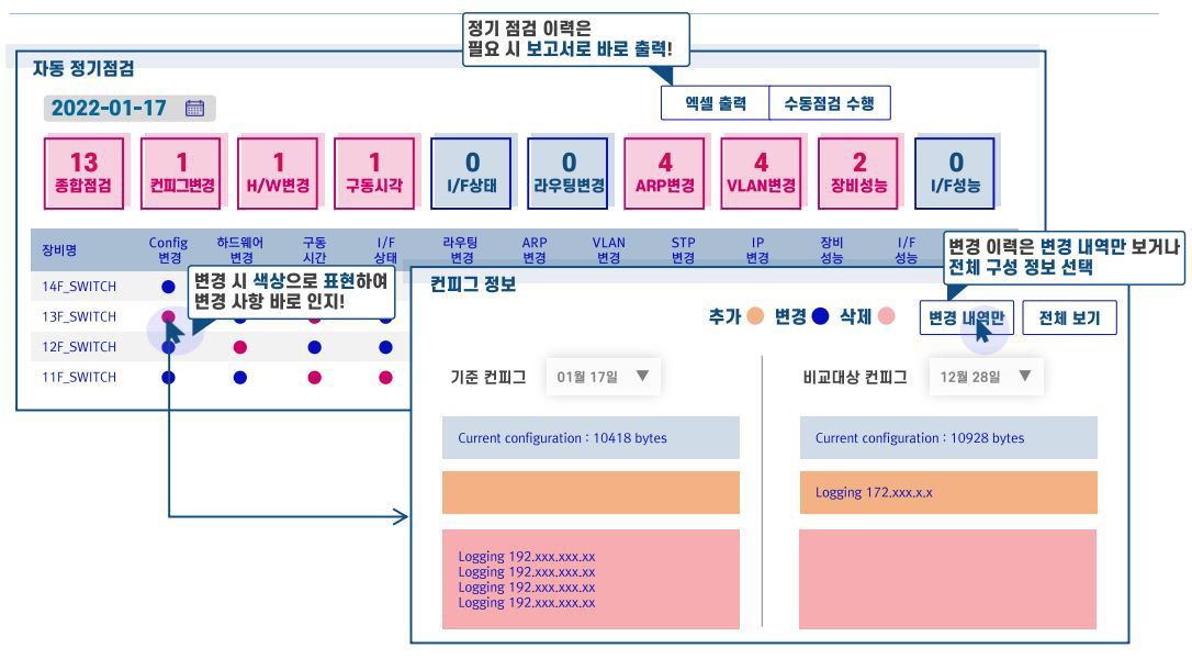 - 컨피그 변경, 하드웨어 변경, 라우팅 변경, ARP 변경, VLAN 변경, STP 변경, IP 변경 등 구성/성능 정보 자동 점검