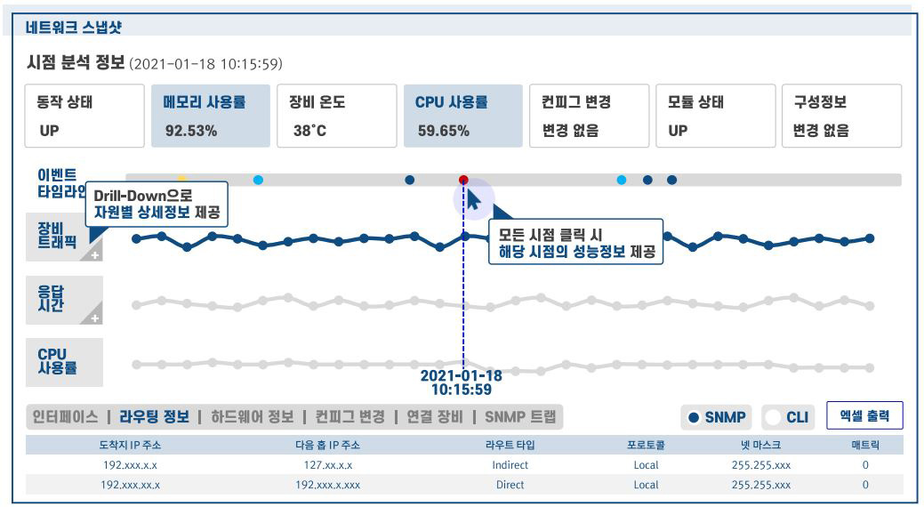 - 스냅샷을 통해 특정 시점의 라우팅, 컨피그, 연결 장비 등 상세 정보 제공으로 정확한 장애 원인 파악 지원