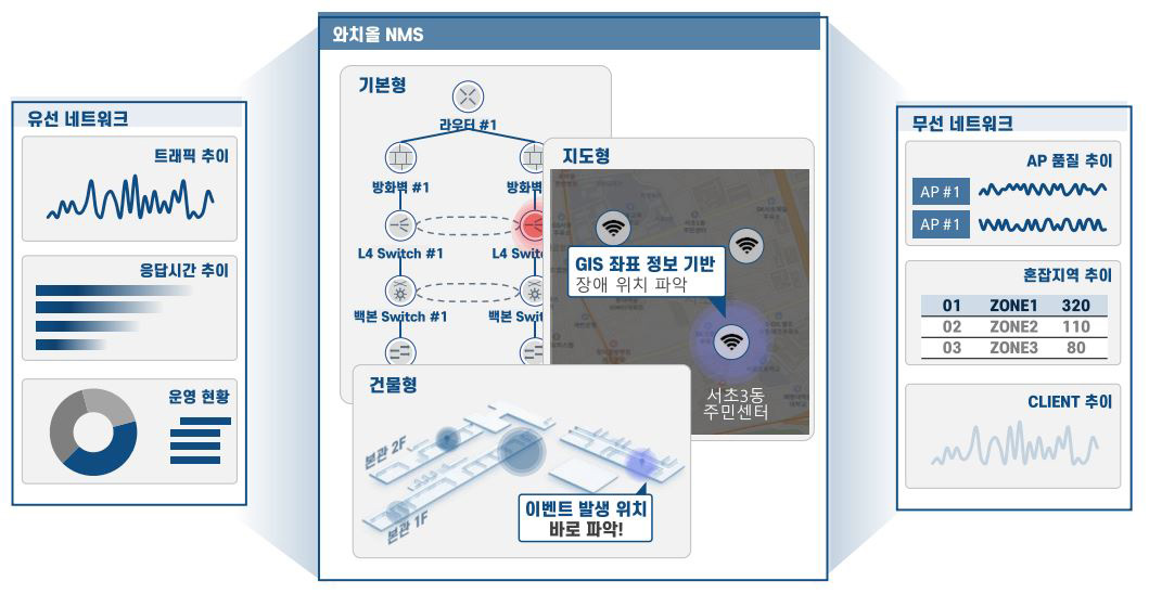 - 중요 유/무선 네트워크 장비를 한 화면에서 통합 모니터링