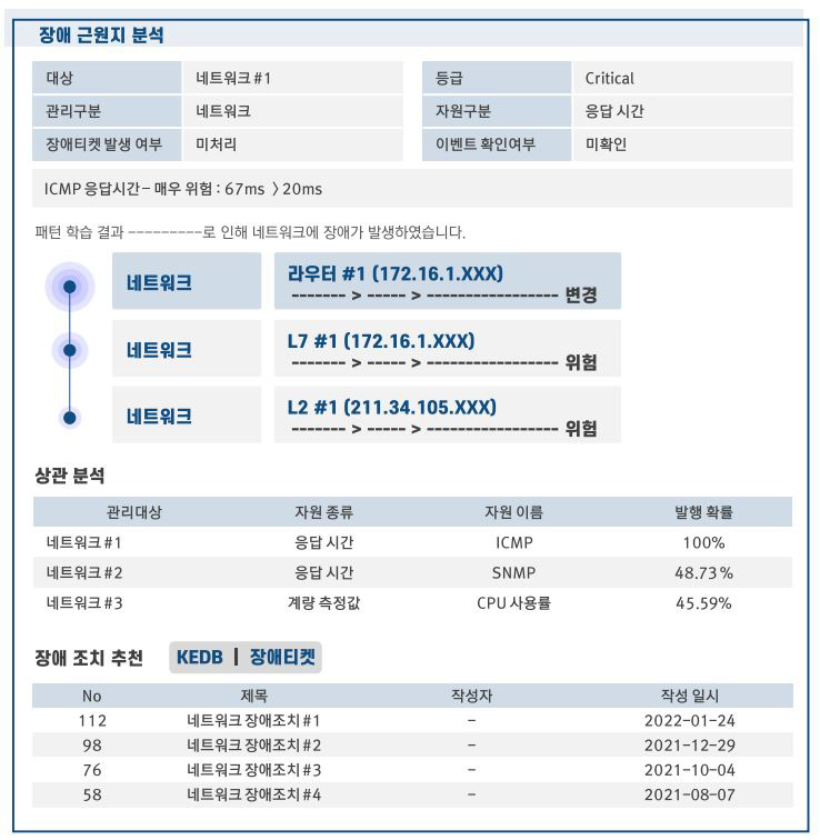 - 오류 이력을 기반으로 대상 간 상관 분석을 통해 연관 오류 발생을 미리 예측하여 사전 조치 지원