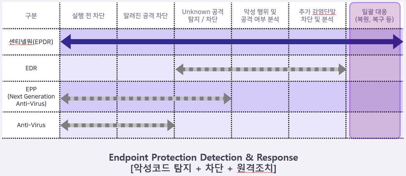 Gartner가 정의한 EPP(Endpoint Protection Platform)는 파일 기반 멀웨어(악성코드)를 방지하고, 신뢰할 수 있는 애플리케이션과 신뢰할 수 없는 애플리케이션의 악의적인 활동을 탐지 및 차단하고, 보안 사고 및 경보에 능동적으로 대응하는 데 필요한 조사 및 치료 기능을 제공하기 위해 엔드 포인트 장치에 배포되는 솔루션입니다.