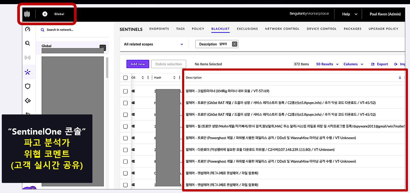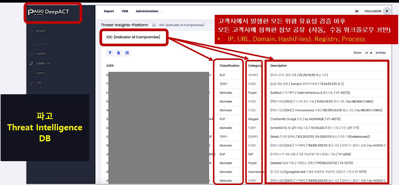 파고 DeepACT 위협 분석가는 CylancePROTECT, SentinelOne, Stellar Cyber 솔루션이 탐지/방어 성공한 모든 위협을 다시 분석하는 과정에서 'IOC/IOA'가 나온 경우, PAGO TIDB로 저장 및 고객사에 공유합니다.