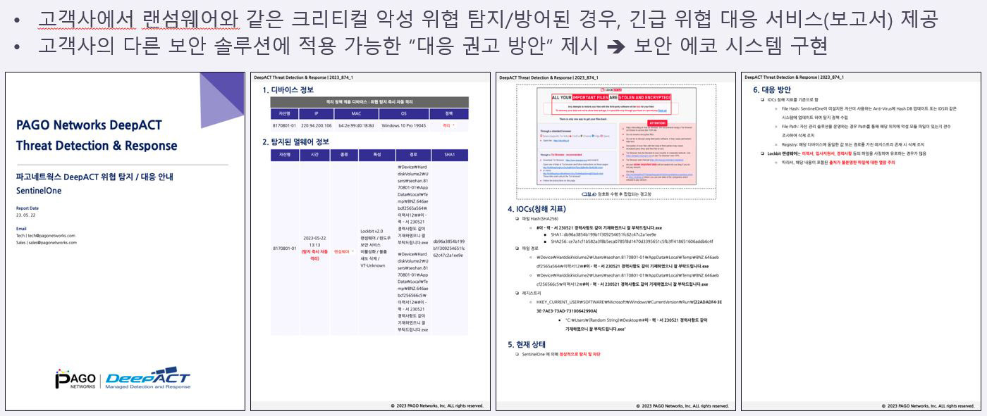 파고네트웍스에서 제공한 보안 솔루션 탐지, 방어 여부와 상관없이 모든 고객은 파고네트웍스에 '특정 위협 파일 및 이벤트' 분석을 의뢰할 수 있고, 파고네트웍스는 상세 분석 후 보고서를 작성하고 제출합니다.