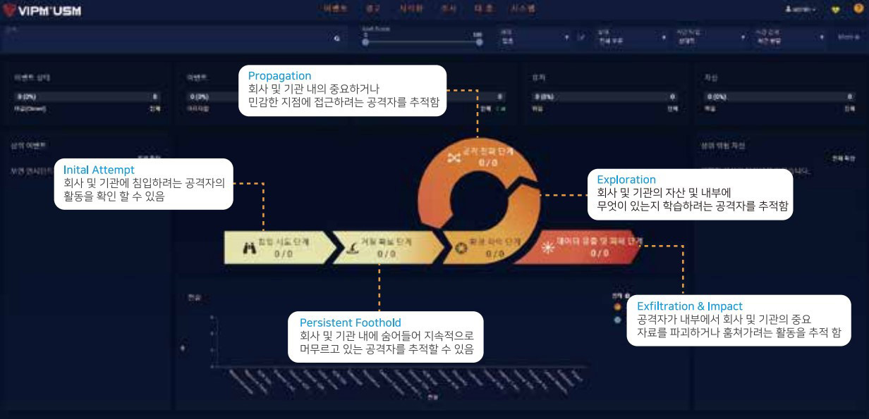 VIPM-USM은 MITRE ATT&CK 기반의 최신 분석 모델링을 제공함으로써 악성코드, 위험 파일 등에 의한 실질적인 위협에 적극적인 대응을 할 수 있도록 합니다.