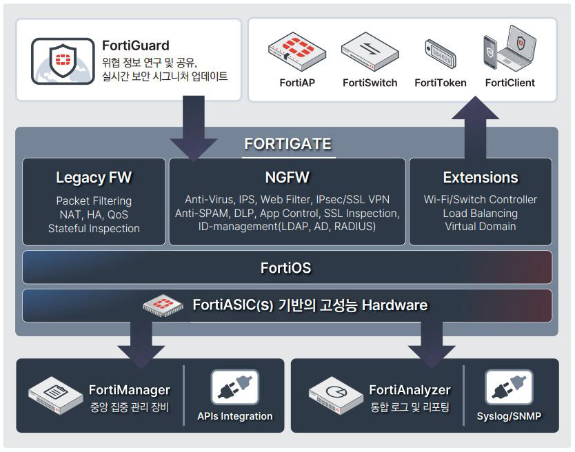 FortiOS를 통해 어떤 규모의 기업이라도 통합된 방화벽, IPS, 애플리케이션 제어 및 웹 필터링 등으로 최신 사이버 보안 위협에 대한 전방위적 방어뿐 아니라 유무선 네트워크 관리 및 제어를 최적의 비용으로 운용이 가능합니다.