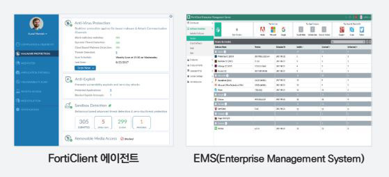 포티넷의 엔드 포인트 보안 솔루션인 FortiClient는 Anti-Virus 엔진과 Anti-Exploit 엔진을 이용하여 능동적인 엔드 포인트 방어가 가능하며 VPN 기능을 제공하여 안전한 원격 접속 기능을 제공합니다. 또한 패브릭 기반의 FortiClient는 EMS를 통해 통합된 엔드 포인트 가시성 제공과 컴플라이언스 제어가 가능합니다.