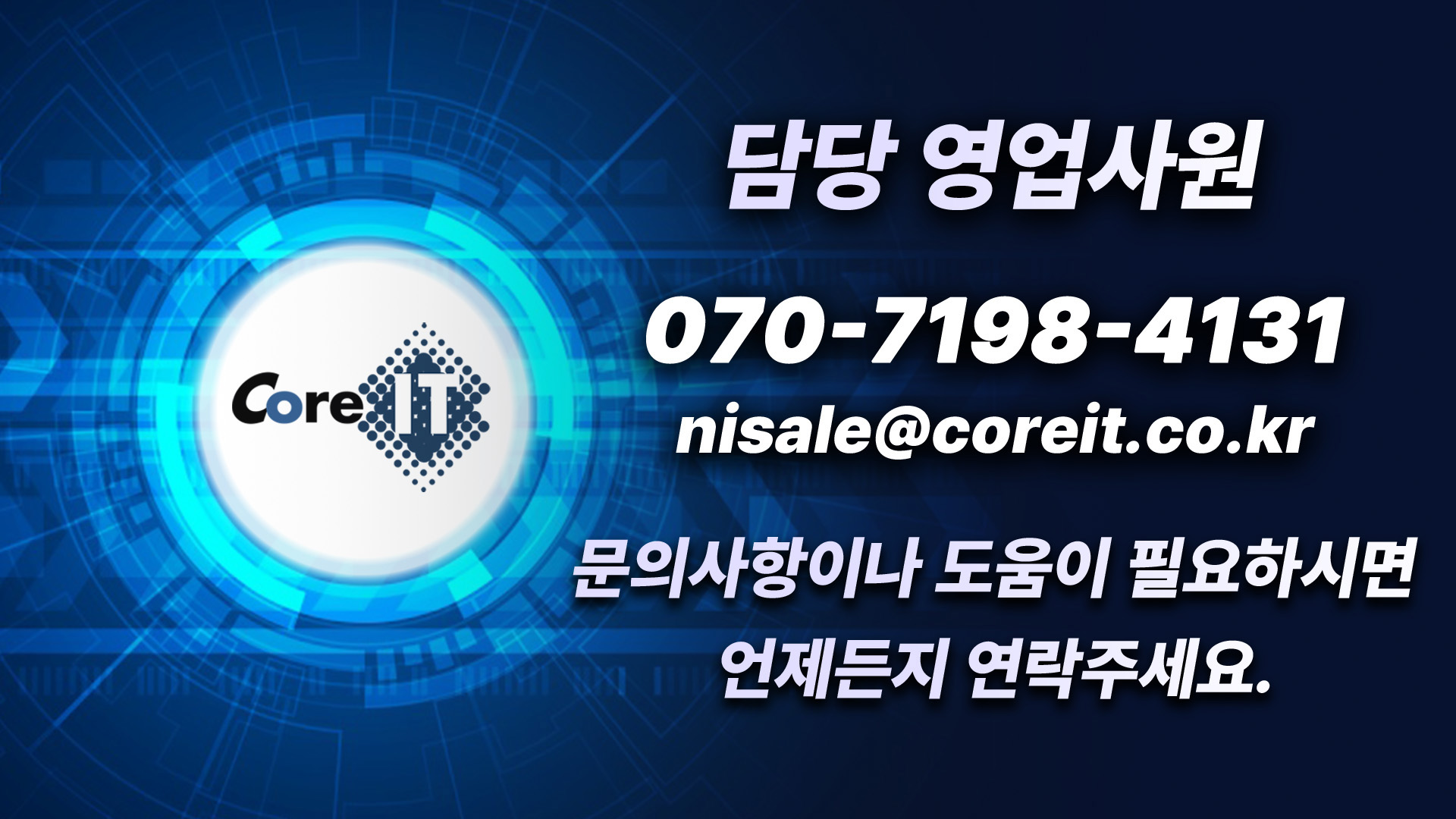 코아아이티에서는 기업 및 기관의 특성, 인원, 요구사항 등이 반영된 모델을 제안하고 구축 및 유지 보수를 진행하고 있습니다. 보안 솔루션 관련해서 궁금한 점이 있거나 기타 솔루션 및 제품의 상세한 내용은 메일이나 전화 주시면 친절히 답변 도와드리도록 하겠습니다.